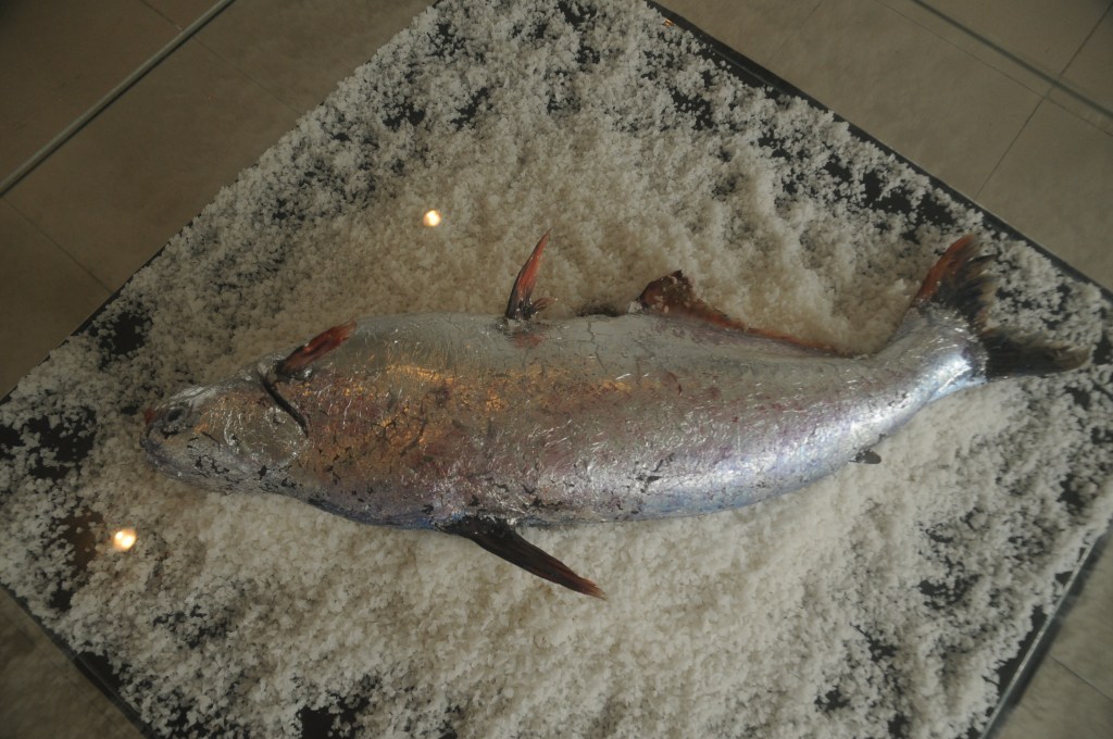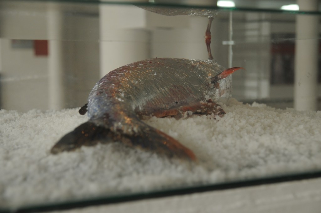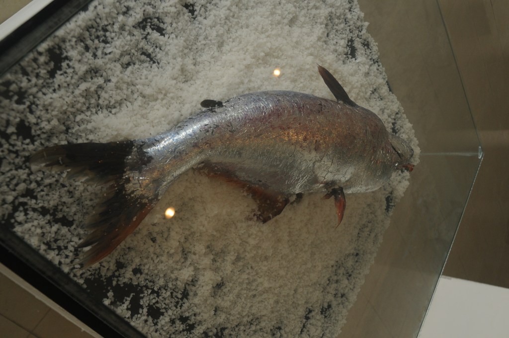 Dead fish, silver paper, salt, glass box